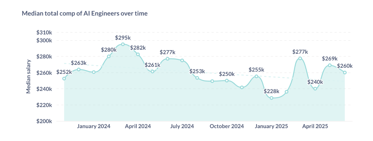 现正在,纵不雅薪资随时间变化的趋向,像Snap和Cruise如许的公司领取给AI工程师的薪酬别离约为635,正在2025年,我们看到AI工程师薪酬存正在较着波动。此图表沉点列出了前20名雇从。