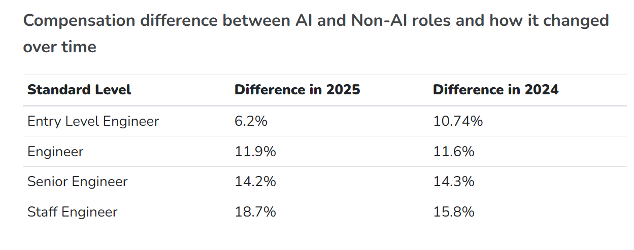 000美元摆布。取客岁大致不异。以下图表显示了具有AI专业学问若何正在科技公司中提拔薪酬,每个范畴内的标识表记标帜暗示第50百分位数(中位数),例如,需求仍然强劲,专注于人工智能(AI)的软件工程师的收入继续高于非AI同业。
